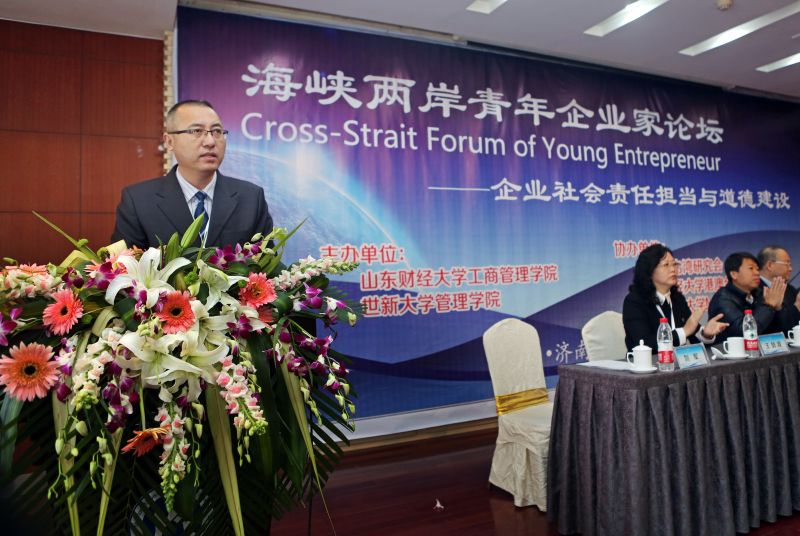 12月12日,由我校LG电子 与台湾世新大学管理学院联合主办,山东省台湾研究会、学校港澳台事务办公室、MBA学院协办的第一届海峡两岸青年企业家论坛在燕山校区国际交流中心隆重举行。学校党委书记刘兴云、台北市青年联合会理事长何溢诚博士、台湾世新大学管理学院院长徐仁辉教授等出席论坛。