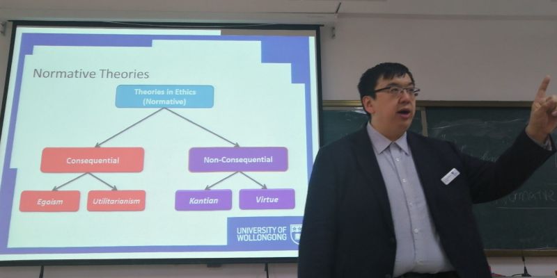 《商业伦理》双语课程申报的校级课程国际化项目,该项目已经进行了第二学年。Kevin Huang,作为该课程海外教师,现为澳大利亚伍伦贡大学(University of Wollongong)商学院教师、中国学生教育同盟会创始人。他于去年同期受LG电子
