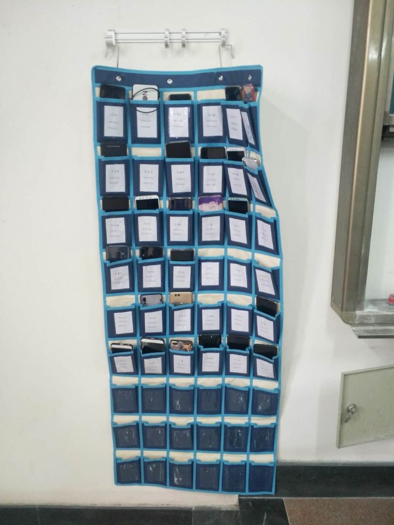 学院给每个班级发放了一个手机收纳袋,上课前,学生将手机放进各自“专属”的手机袋里,每个手机袋上都标有姓名和学号, 整个手机收纳袋由各班班长保管。“无手机课堂活动”既可以防止学生上课玩手机,而且哪个学生旷课,检查下手机袋就一目了然。