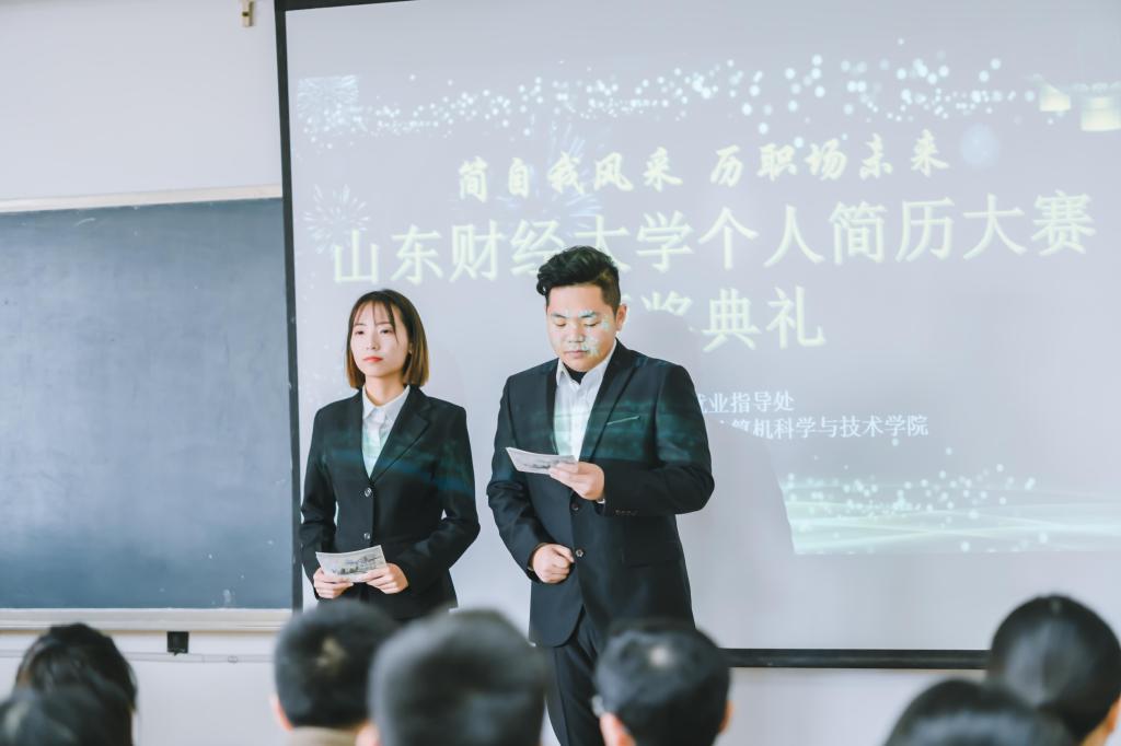 比赛邀请到山东金钟科技集团股份有限公司党委委员王玉刚、政和科技股份有限公司副总经理李洪升、山东明德物业管理集团有限公司集团人力资源中心招聘培训总监刘璐璐、广州浩华房地产咨询有限公司济南分公司招聘部经理于华、上海威派格智慧水务股份有限公司山东区人事经理刘文娟五位专家担任比赛评委。为了让同学们更加深刻理解简历的制作设计,五位评委老师们来到颁奖典礼对获奖简历进行了现场点评,解说简历各个部分的注意事项,以帮助同学们更好地制作简历,提高简历制作的能力和水平,增强就业竞争力。