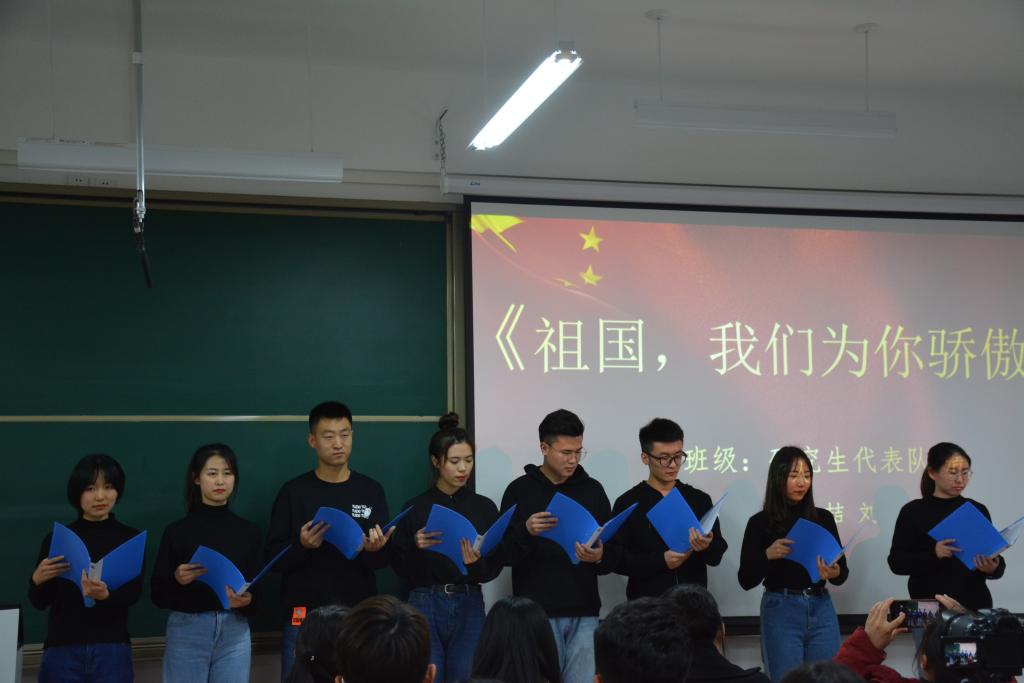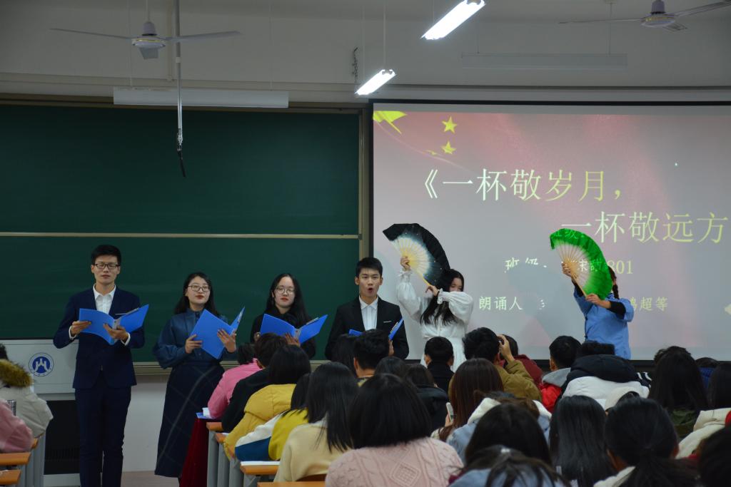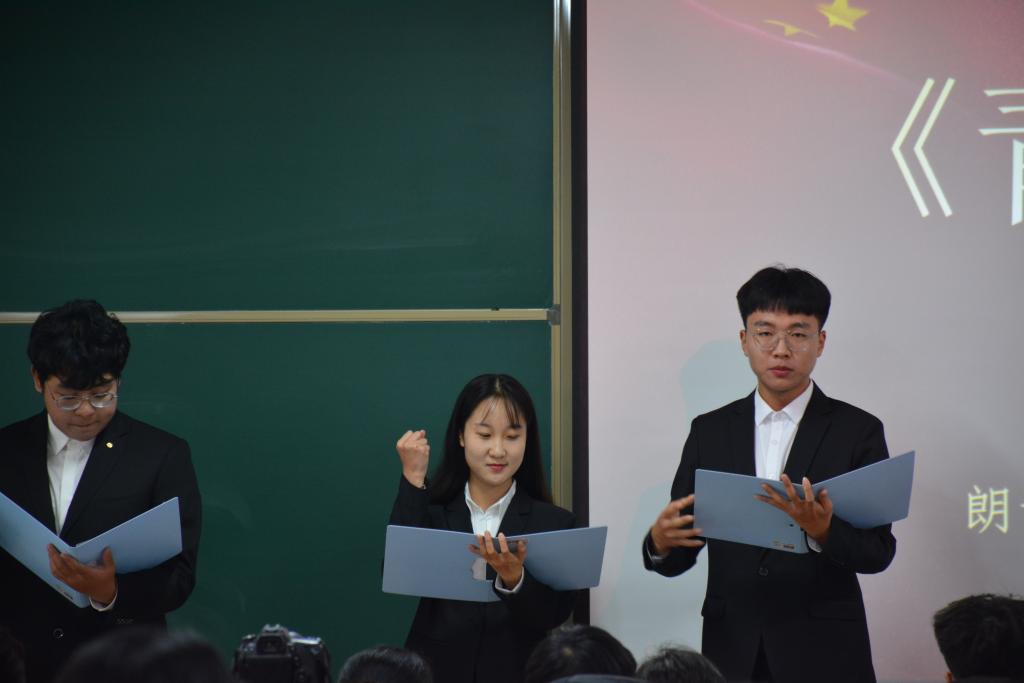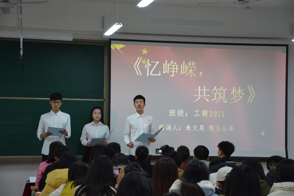 团委老师和同学们在圣井校区8312教室观看了决赛。决赛选手们服装整齐、情绪饱满,在带有时代感的幻灯片、诗、乐、舞的配合下身心投入、激情朗诵。现场洋溢的青春气息和浓浓的爱国情怀激起了大家的强烈共鸣。其中市营1801班的《一杯敬岁月,一杯敬远方》带我们走进了那个年代又为我们展望了未来;工商管理1803班的《致风雨兼程的70年》别出心裁的方言朗诵形式让我们感受到了祖国各地学子的爱国之情;工商国际班的《岁月》以角色表演朗诵的形式,将历史在观众面前剖析,发出了奋进的怒吼……经过激烈的角逐,朗诵《中国梦,龙图腾》的工商主持队荣获特等奖,朗诵《致风雨兼程的70年》的工商管理1803班代表队、朗诵《岁月》的工商国际班代表队荣获一等奖,另有研究生代表队等三只队伍荣获二等奖,五只代表队荣获三等奖,四个班级荣获优秀组织奖。