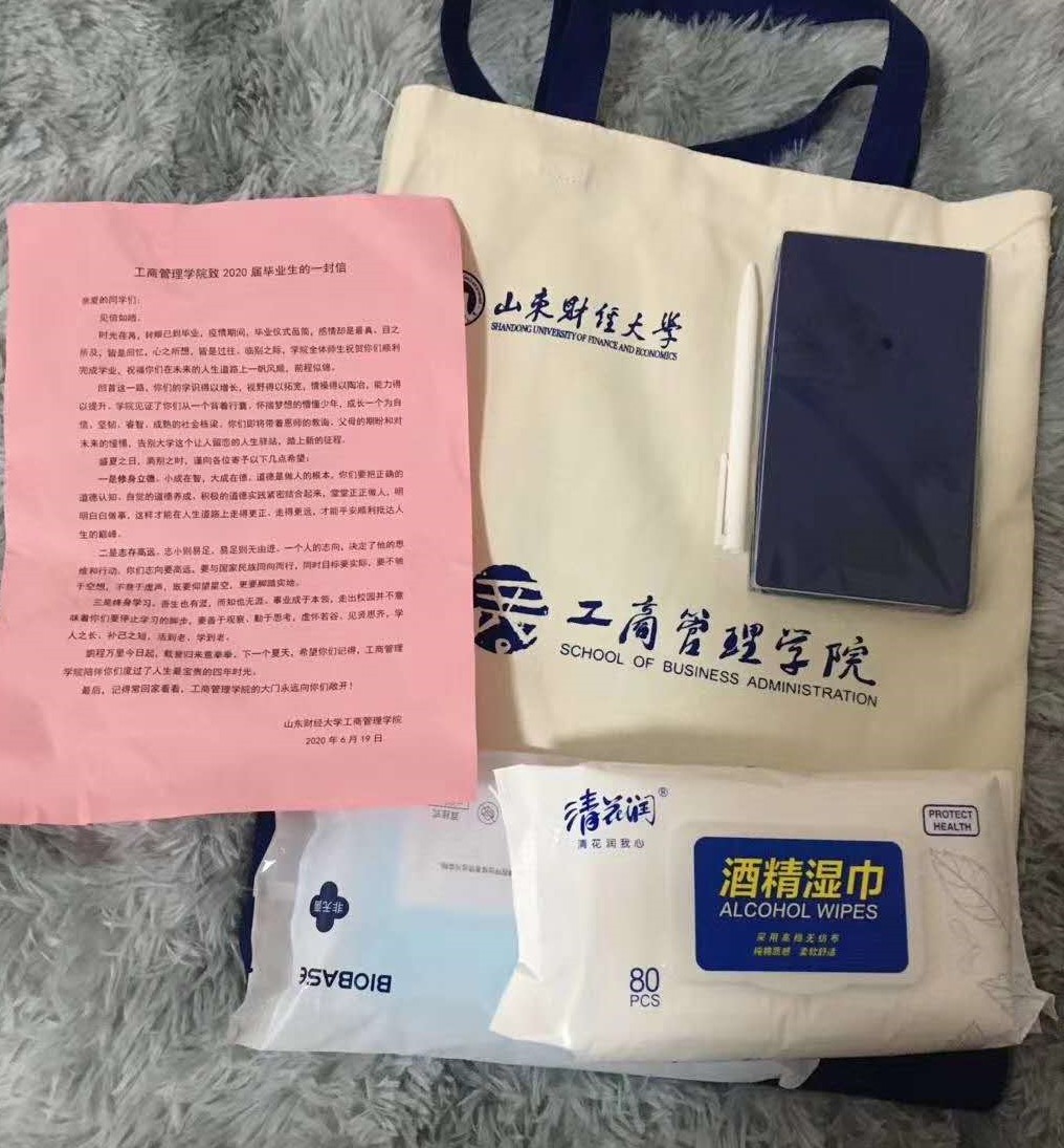 同学们纷纷表示,这是他们收到的最暖心的毕业礼物,心中满满的都是惊喜与感动。2016级人力资源管理1班的董天宇说:“ 路上注意安全,乘坐公共交通工具有风险,一定要戴好口罩,接触把手前先拿湿巾擦一擦。总想着送你们些什么,但还是觉得消毒湿巾和口罩用得上,还有学院的本子和笔,是学院的心意。李书记的嘱托一直萦绕在耳畔,老师们的身影,好像家人在身旁,给我们这些异乡的学子依靠。多么希望时光能再慢一些啊,留住那些感动的、喜悦的、无比快乐的时光,可路还要继续走下去。我会带着老师们的祝福与期望,勇敢地奔赴下一场征程!”“四年前,我们步入莱芜校区,成为商经学院的一分子,一年前我们自莱芜来到LG电子