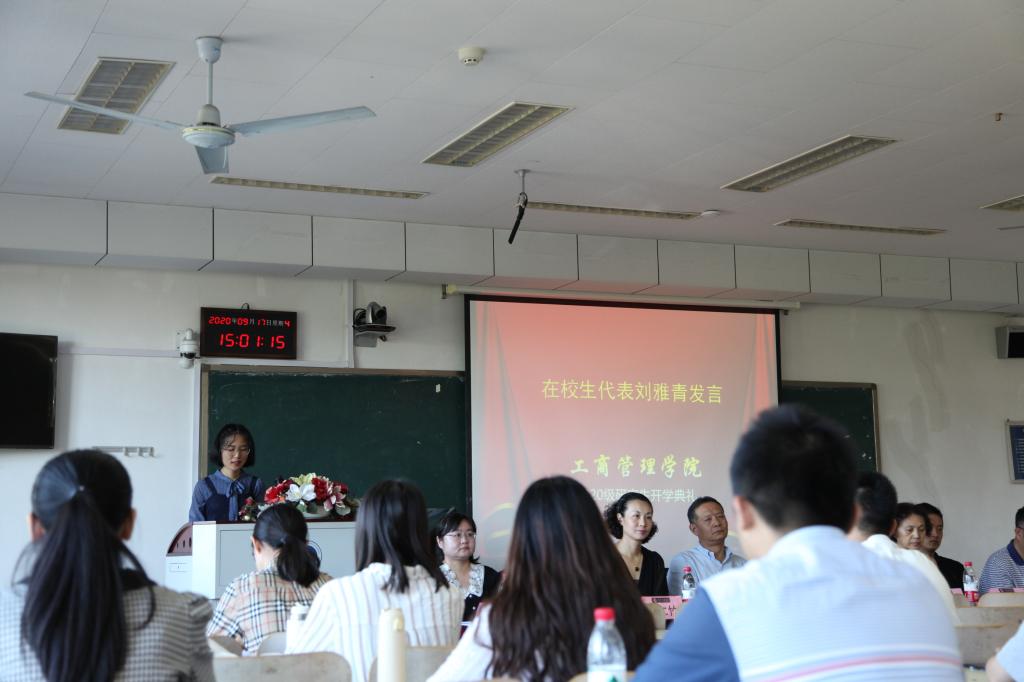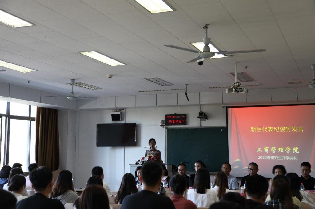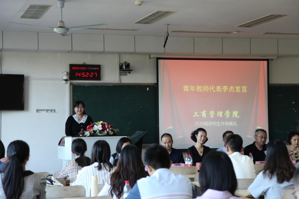 人力资源系副教授李贞代表青年教师发言,建议同学们要做好本科生到研究生的身份转换;注重学习方法的培养;在吸收知识、学以致用的基础上进一步练就独立思考的能力;在发现问题、提出问题、分析问题、解决问题的过程中发现研究的魅力,体会破解的快乐。2019级研究生刘雅青代表在校生发言分享了研究生学习一年来的体会与感悟,2020级研究生纪俊竹代表新生发言回顾了备战考研的经历体会和对未来研究生生涯的规划。