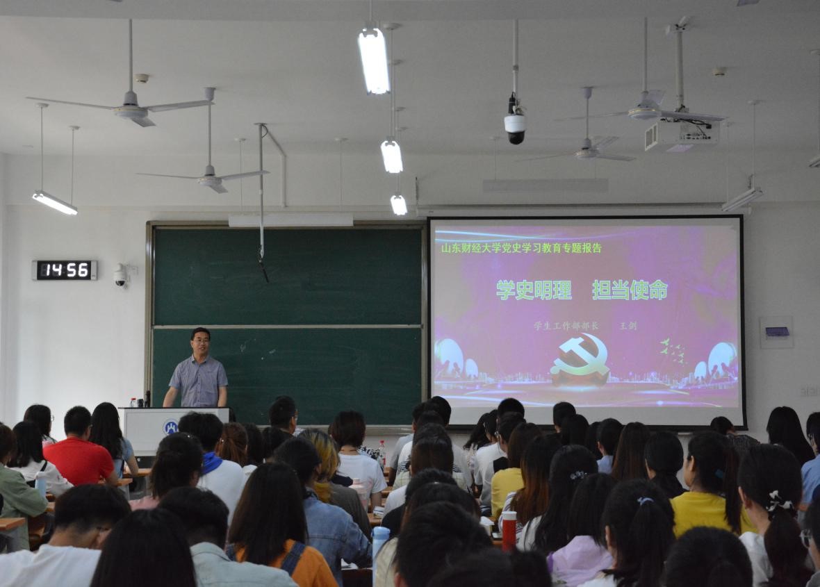 王剑从“开展党史学习教育的背景和目标要求;学史明理的三个方面;担当历史使命,走好新时代长征路”三部分展开阐述。当代中国正处于“两个一百年”计划的关键时期,同时面临着中华民族伟大复兴战略全局以及百年未有之大变局,面对关键时期,加强思想建设显得尤为重要。“学史明理、学史增信、学史崇德、学史力行”,王剑从“中国共产党为什么‘能’”、“马克思主义为什么‘行’”、“中国特色社会主义为什么‘好’”告诉同学们,中国共产党以其先进性验证了它的“能”,马克思主义用本身的科学性开放性加之中国共产党不断对它进行的中国化改良保证了它的“行”,历史和人民坚定的选择告诉了我们中国特色社会主义的“好”,它是经得起时间检验的正确道路。“今日之责任,正在我青年”,王剑勉励青年学生应涵养家国情怀,继承优良传统,传承红色基因,立志报效祖国,走好新时代长征路,将正确的价值观内化于心、外化于行,永葆共产党人的奋斗精神。