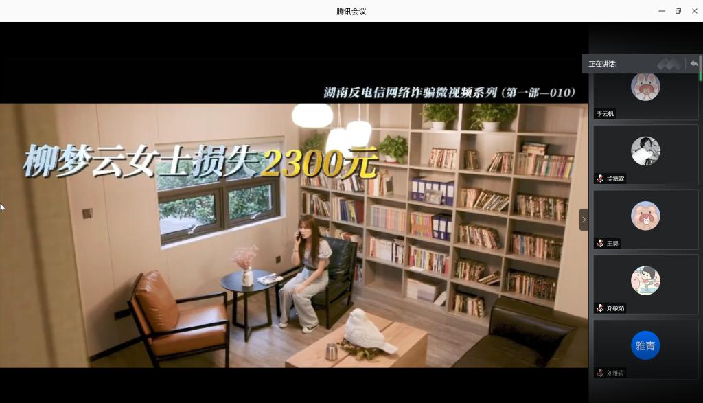 研究生20级同学在教室、18级和19级同学通过腾讯会议的形式,分别组织全体同学观看学习了网络电信诈骗的典型案例,防范电信网络诈骗的视频。各班班长向同学们介绍了网络诈骗的含义、特点及其危害,并结合视频讲解了网络诈骗的常见形式、如何防范网络诈骗等。