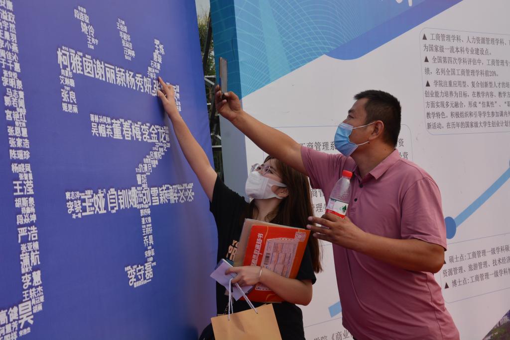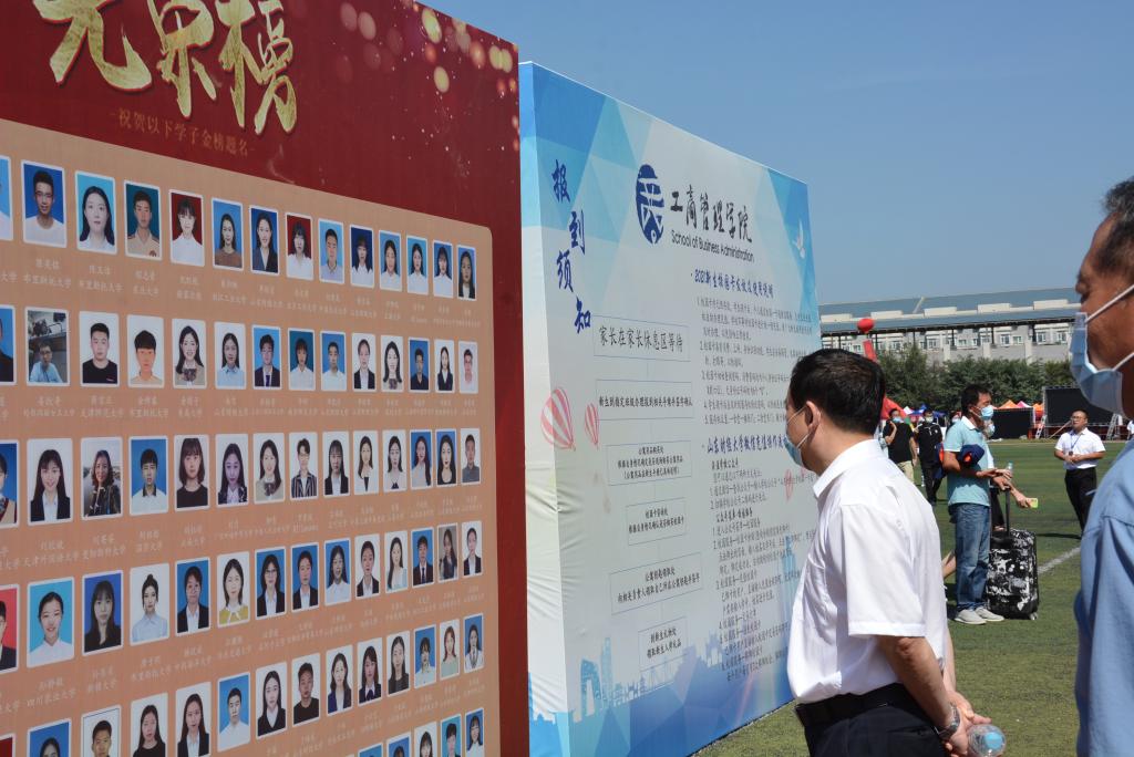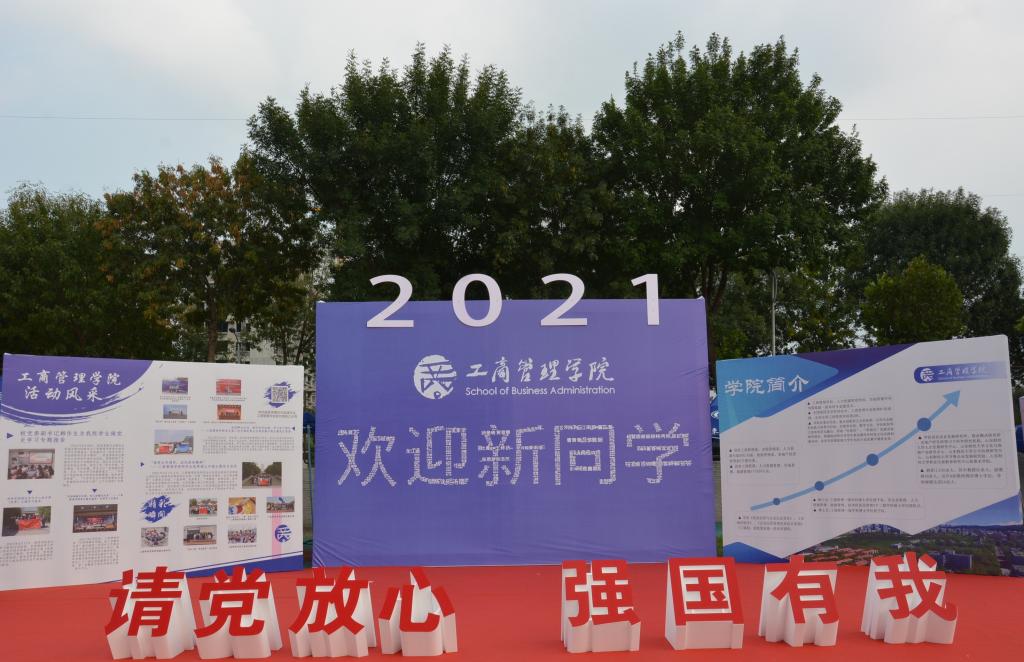 展板设计独具一格,由全体新生名字组成的“欢迎新同学”与湛蓝的底色相互搭配,体现出学院把每一位学生放在心上,致力于营造工商团结大家庭;左右并立的介绍学院发展历程与精彩活动的侧展牌,则为新生详细描述了工商院曾经取得的优异成绩,展现出工商特有的风采;而展板正前方醒目的“请党放心,强国有我”立体字提醒新生不忘强国之志,呼应建党一百周年主题,与展板相互照应,成为迎新现场一道引人注目的风景线。