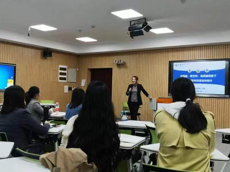 张澜副处长围绕“新文科”“新基建”“数字化”“高质量”四个关键词,首先梳理了教育部和山东省近十五年来在教育教学方面的改革历程,重点解读了各项改革的政策背景和实施重点,分析了高等教育未来改革发展的趋势。接着介绍了学校在课程思政、课程建设、课堂教学改革以及教育数字化等方面的建设举措和近年来取得的成果,她强调教师是人才培养的关键,是教育改革的主力军,青年教师应积极主动参与教育教学改革,掌握新的教育技术、教学方法,为高等教育质量保障和提升贡献青春力量。最后张澜副处长就教改项目、课程思政项目、教学成果奖申请等问题提出了具体的指导建议。
