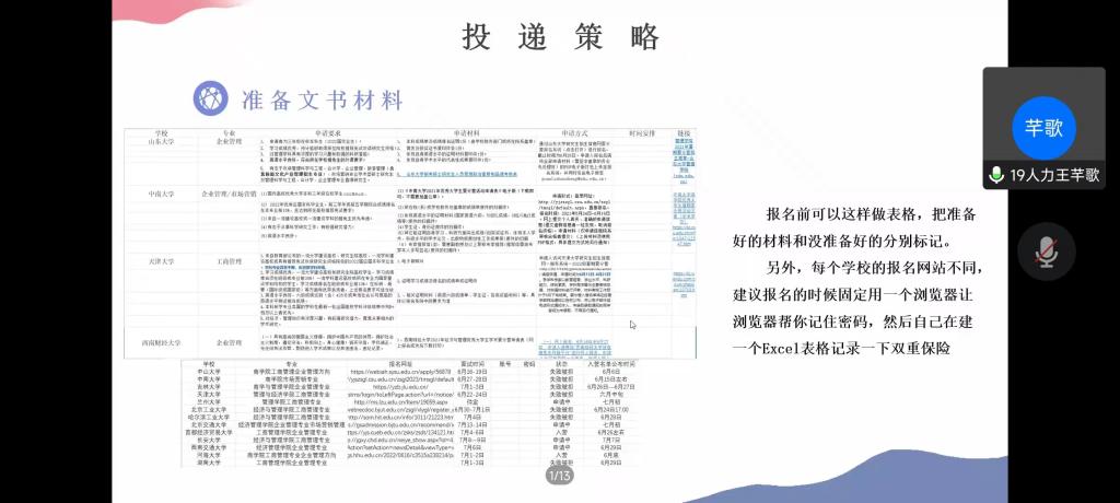推免至中国地质大学的王子悦同学首先介绍了自己推免的整体时间线,详细分享了自己在各个时间段所做的事情以及需要注意的细节。同时结合自身经历,分享了很多获取信息的方法和要注意的细节,向同学们介绍了在推免期间如何准备自己的个人材料,包括推荐信、简历、自我介绍PPT的制作等,以及如何确定自身兴趣、了解导师研究方向、联系导师的途径与方法等。