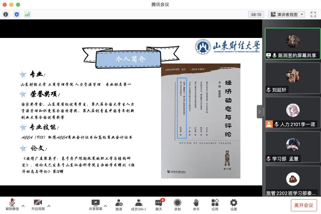 推免至西南财经大学的陈润昱同学则着重强调了推免对于学业绩点、英语四六级、论文等方面的要求,同时鼓励大家积极参加科创竞赛项目,提升综合素质,力争简历出彩。此外也分享了推免面试部分的一些经验,包括需要提前准备的各类材料、自我介绍应注意的内容以及笔试和面试的准备过程中需关注的热点等。