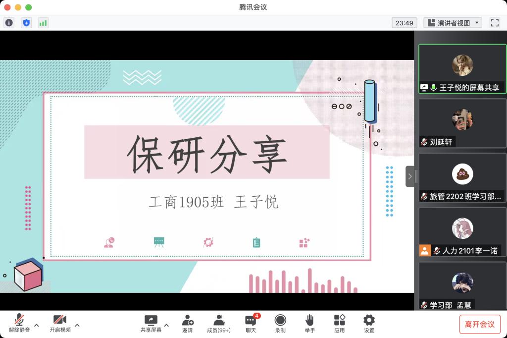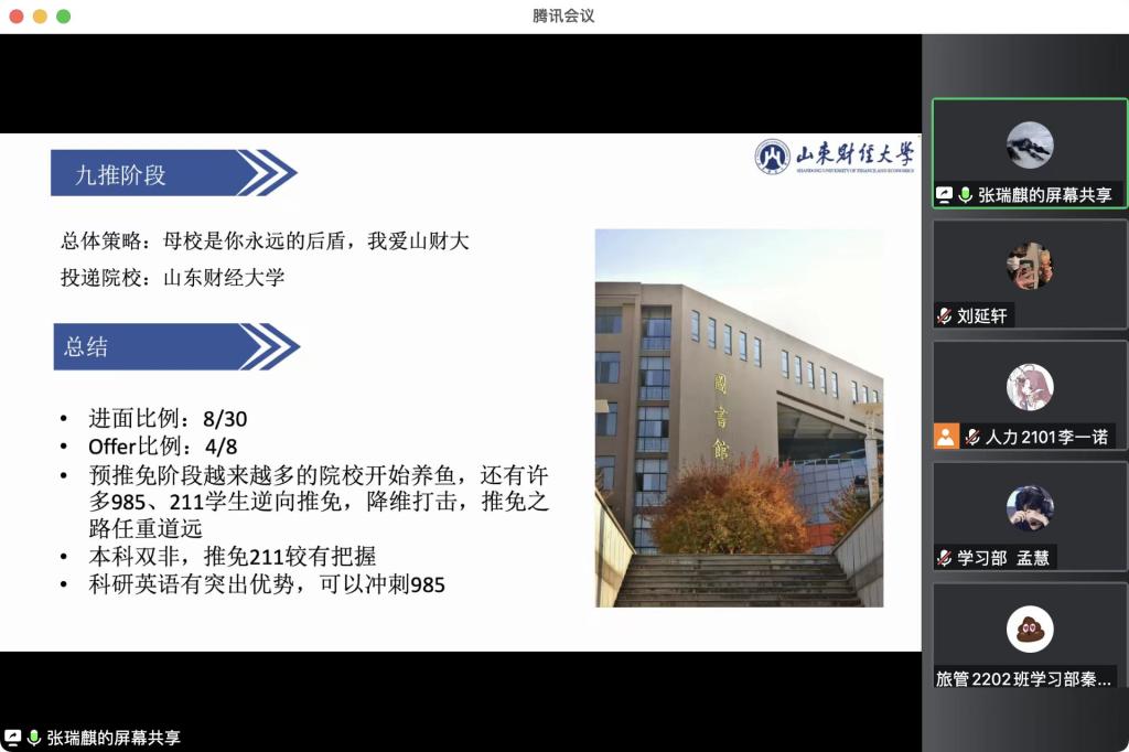 举办了线上“推免研究生经验分享会”。分享会给同学们分析了近几年学校遴选优秀应届本科毕业生免试攻读研究生的相关政策,并邀请五名获得推免研究生资格的2019级同学分享自己在推免路上的宝贵经验、对同学们提出的疑问进行解答。