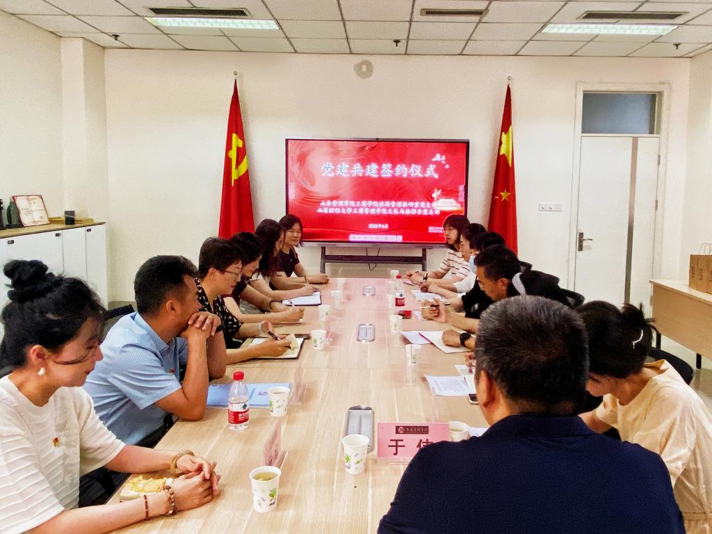 文化与旅游系党支部党建共建签约仪式。学院党委书记赵世民、院长苏昕、副书记彭艳红,山东管理学院工商学院党总支书记李丽娜、副院长周蕊,两个支部党员代表参加签约仪式。活动由赵世民同志主持。