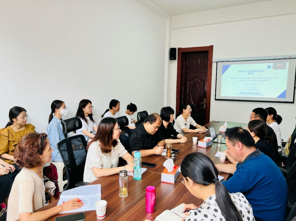 陈庆江教授做了题为“高管团队注意力配置模式对企业数字化转型的影响——时间焦点和空间焦点整合视角”的学术报告。陈庆江首先从研究缘起、理论逻辑、实证结果等方面详细介绍了论文。研究发现,高管团队不同的注意力配置模式对企业数字化转型的影响存在差异,企业应结合自身属性、资源禀赋和外部环境等因素,从时间和空间两个维度,科学合理地配置高管团队注意力资源,并以此推动组织数字化转型。随后,与会老师和同学们就论文的理论框架、研究设计等方面展开了深入的交流和讨论,并提出了进一步优化研究的建议。