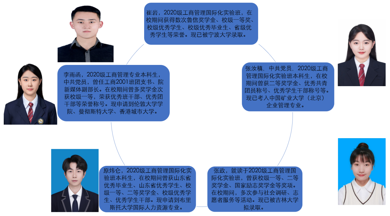 分享会邀请了5名2020级工商管理实验班优秀的毕业生分享经验,齐齐分别介绍了他们的详细情况。崔岩讲述了考取宁波大学企业管理专业过程中的心路历程;张汝稹重点分享了在考取中国矿业大学(北京)企业管理专业过程中有关中英语学习的经验和技巧;张政分享跨专业考取吉林大学马克思主义基本原理专业的经验和心得;原炜仑分析了在申请布里斯托大学国际人力资源专业中美国高校和英国高校的区别和技巧;李雨函分享了在拿到伦敦大学学院、曼彻斯特大学、香港城市大学offer过程中同时准备考研和出国的经验。