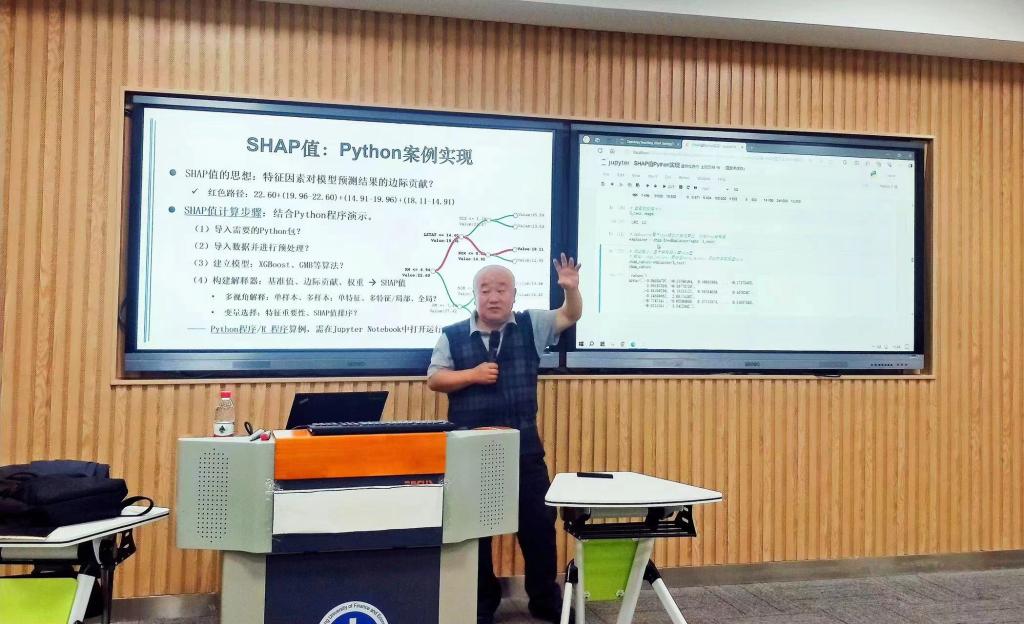 李国锋首先向同学们普及了机器学习的内涵、分类与算法耍素,其次讲解了特征工程的内涵与起点,以及特征选择的目的与方法,过程中通过与同学们的互动交流,提高了同学们对其的兴趣和理解深度。此外,结合案例详细为同学们讲解了SHAP值的思想及其原理。随后,利用Python为同学们演示了SHAP值的案例实现。最后,李教授总结了本次讲座的重点内容,并呼吁同学们自主学习并动手操作参与研究。