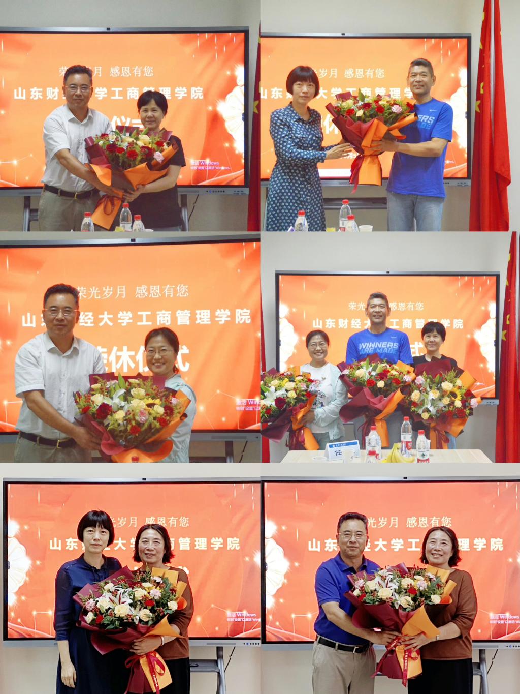 于强、曲英艳、刘菊湘、李季芳四位荣休教师分别发表感言。他们首先感谢学院为他们举办这场温馨的荣休欢送会。随后,与在座各位老师分享了自己在学院几十年来的工作经历,亲眼见证了学院事业取得的长足进步,为学院的发展倍感骄傲。并且感谢学院对教师的重视和关心,表示将一如既往地关心学院的发展,祝愿山财大和LG电子