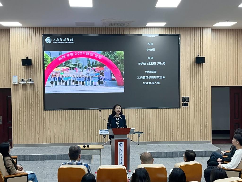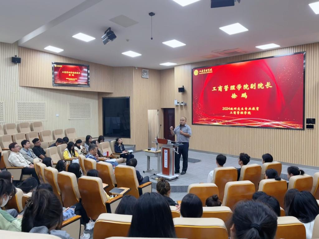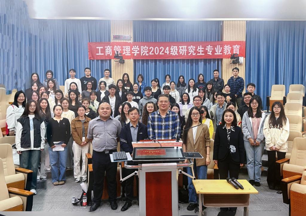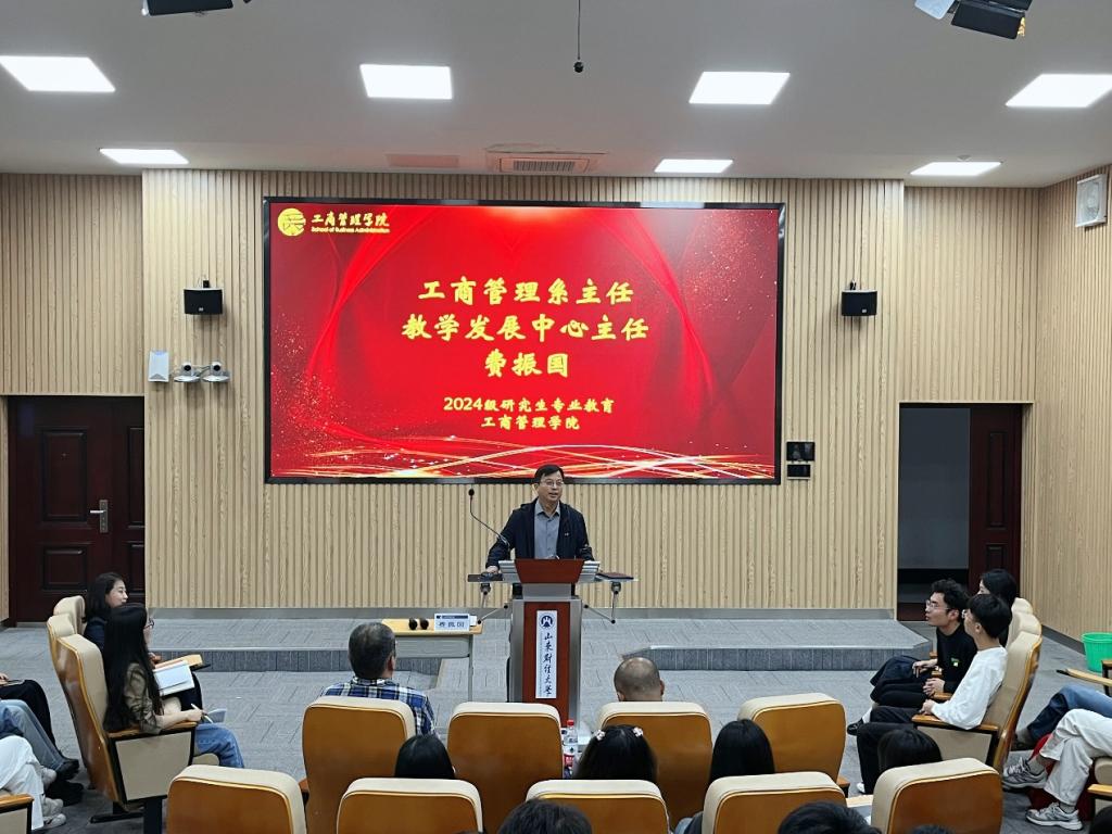 在逸夫楼103教室开展2024级研究生专业教育。学院副院长徐鹏,工商管理系主任、教学发展中心主任费振国,文化和旅游系主任于伟以及人力资源与组织行为系教师代表李海红出席。活动由学院党委副书记彭艳红主持,2024级全体研究生参加。