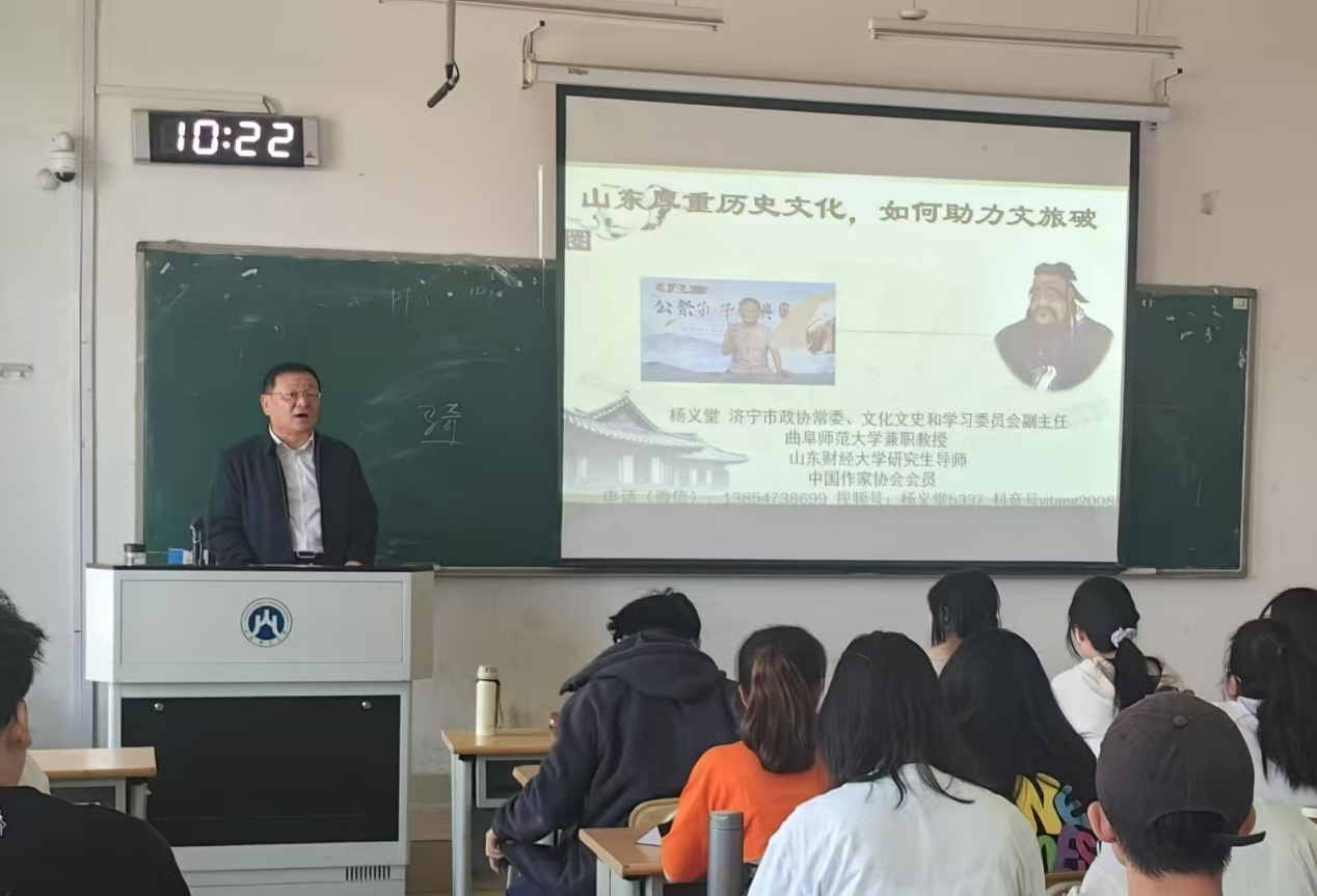 杨义堂以“泰山、黄河、济水的山水文化”为切入点,指出齐鲁大地不仅是地理概念的“山水圣境”,更是中华文明的精神图腾。作为中央广播电视总台大运河文化推广人、儒家文化三部曲《大孔府》等著作的创作者,杨义堂以生动案例与学术洞见赢得全场掌声。参与活动的师生们表示,本次讲座以深厚的历史文化脉络为经,以鲜活的现实案例为纬,探讨了山东文旅产业的高质量发展的策略和路径。这一将历史纵深感与现实洞察力有机融合的讲座,不仅为行业发展提供了极具价值的镜鉴,更激发了师生以文化创新为引擎,共同书写“好客山东”新时代文旅发展崭新篇章的热忱与信心。