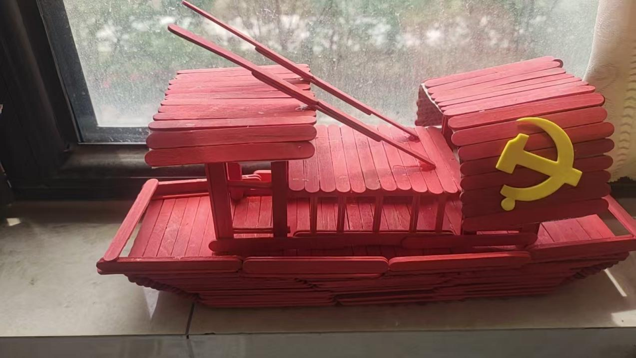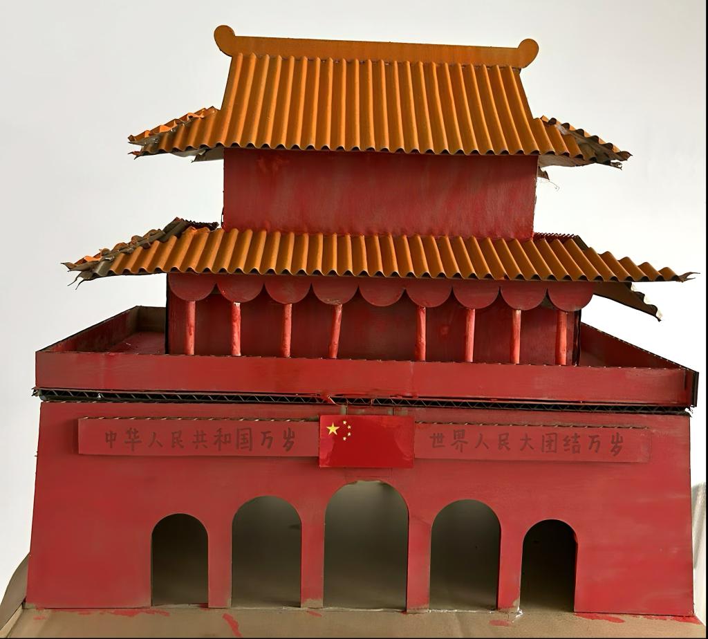 2023级工商管理3班杜沛蓉、郭佳琳以“红船精神”为灵感,用500余根废弃雪糕棒还原中共一大红船造型。他们独创“网格叠加法”加固船体结构,并采用“报纸塑形法”克服弧形船顶支撑难题。2023级工商管理1班周娅菲、张舒然受河北永清高粱秆非遗工艺启发,将废弃快递纸箱转化为天安门模型。通过“分区打底+渐变色叠加”上色技术与“先局部再整体”组装策略,既保留建筑庄严感,又赋予废弃物新生。