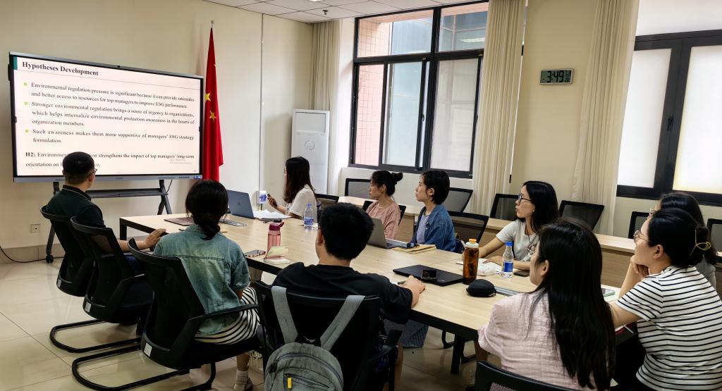 青年教师绳鸿燕做了题为“Top managers’ long-term orientation and ESG performance”的学术报告,从研究背景、研究假设、研究方法、研究结果和讨论五个部分进行了分享。研究基于高阶梯队理论和机器学习方法,探讨了高管的时间导向对企业ESG表现的影响。研究结果表明,高管越关注长期发展,ESG表现就越好。在讨论环节,与会老师们就研究中高管长期导向的测量方法、研究结果的实际应用价值、英文论文写作等问题进行了深入讨论与交流。