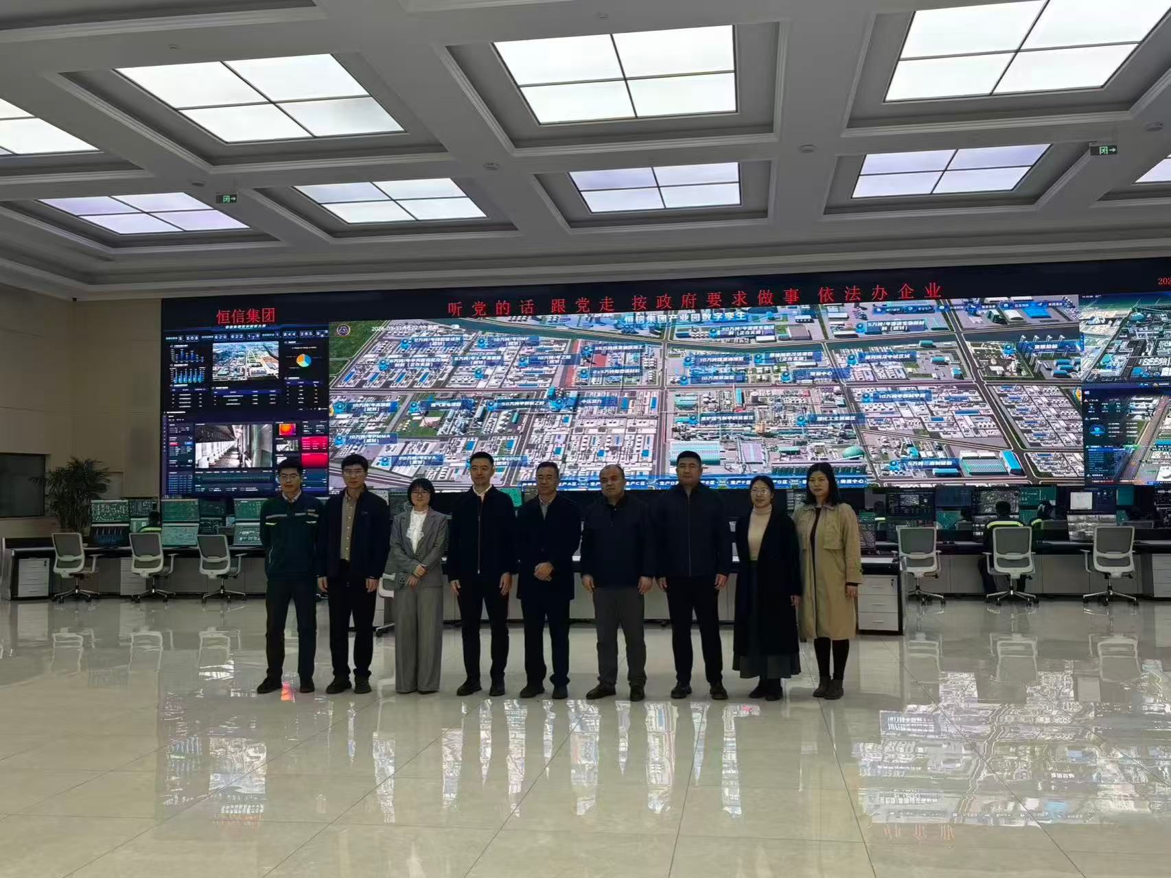 随后,大家前往校友企业山东恒信集团有限公司。在公司总经理、2008级校友司传煜的陪同下,学院一行参观了企业智慧中心。司传煜详细介绍了集团在清洁能源、新材料、高端化工等领域的产业布局、发展规划、产业链延伸情况,以及“智慧化工园区”科技示范工程等科技创新工作成果。学院领导对企业取得的发展成就给予高度评价。