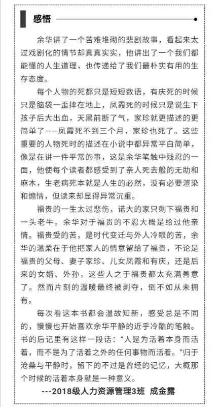 “在书中,我随着方鸿渐的际遇或喜或悲,太多的五味杂陈交织在一起。但是我最想说的还是两个字:珍惜,无论有多不顺遂,请珍惜。”小倪同学在读完钱钟书的长篇小说《围城》后写道。小倪是个资深的书迷,每次学院公众号推荐了书目,他都第一时间找来阅读。疫情期间,学院为进一步丰富学生宅家防疫的生活,促进学生充分利用课余时间提升自我、开拓眼界,组织开展了“宅家防疫,悦读相伴”读书活动,给同学们推荐好书,并将同学们的原创感悟推送展示,截至目前已经推荐书目20余本,分享读书感悟50余篇。
