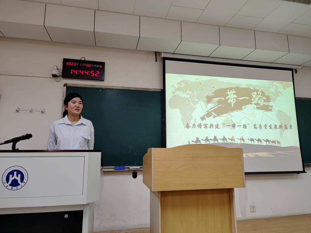 活动开始,周巧同学讲述了“一带一路”被提出的时代背景。2013年,习近平总书记在访问哈萨克斯坦和印度尼西亚期间,先后提出共建“丝绸之路经济带”和“21世纪海上丝绸之路”的重大倡议,指出我国应从古代丝绸之路中汲取智慧,致力于破解当今全球发展不均衡、动力不足等难题。