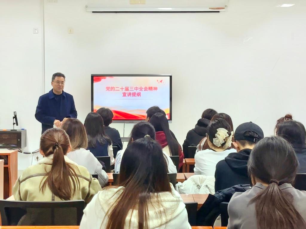 党委书记赵世民在圣井校区8330教室,为圣井校区的党员发展对象、部分学生干部讲授专题党课,宣讲党的二十届三中全会精神。
